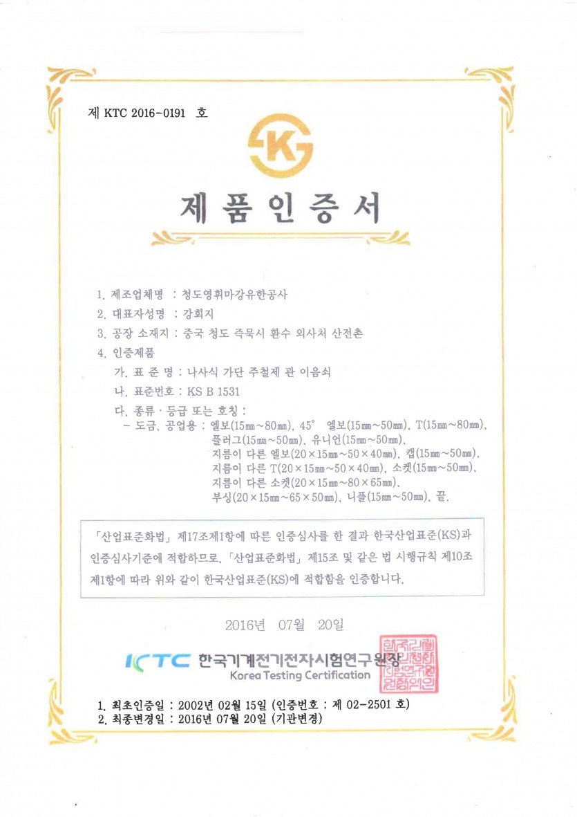(주)유진피팅 주철제관이음쇠 KS 인증서