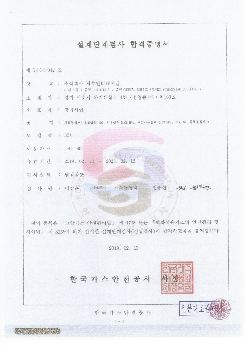 황동가스볼밸브 32A 합격증명서